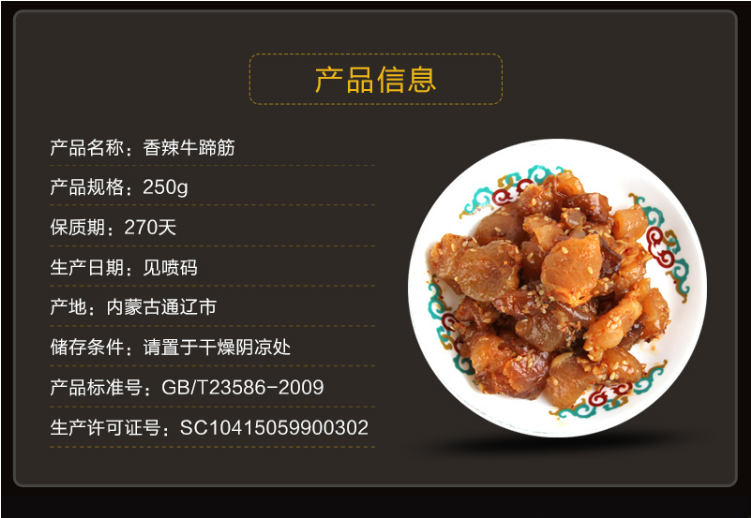 商品名稱(chēng):內(nèi)蒙特產(chǎn)牛蹄筋麻辣味熱銷(xiāo)下酒休閑零食250g牛蹄筋拉鏈包裝