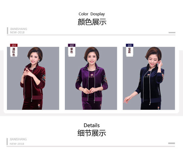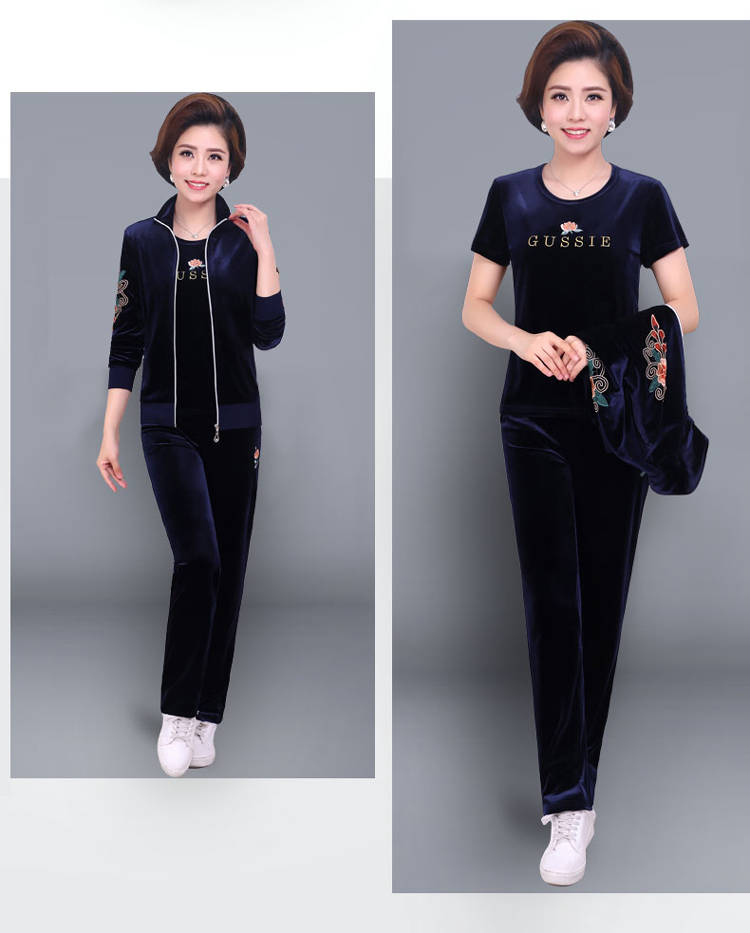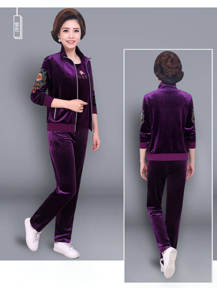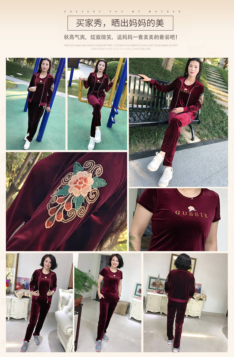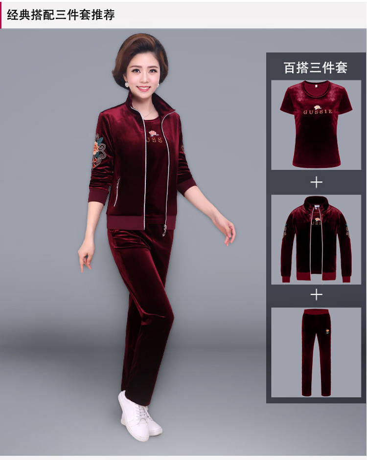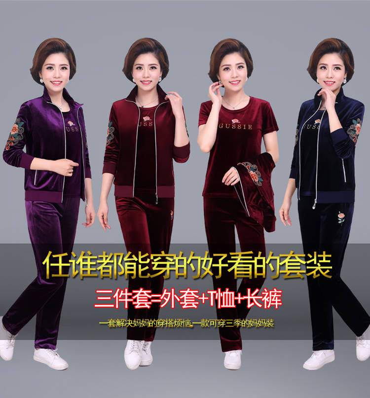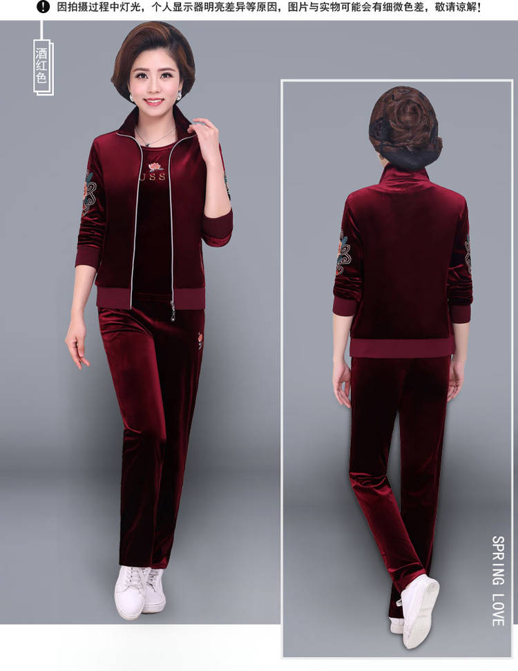商品名稱:春秋三件套金絲絨套裝媽媽春裝外套中年女裝大碼運(yùn)動(dòng)套裝女
