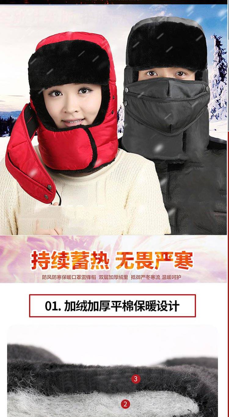 商品名稱(chēng):冬季帽子女韓版雷鋒帽男東北護(hù)耳棉帽冬天戶(hù)外騎車(chē)防風(fēng)保暖防寒帽