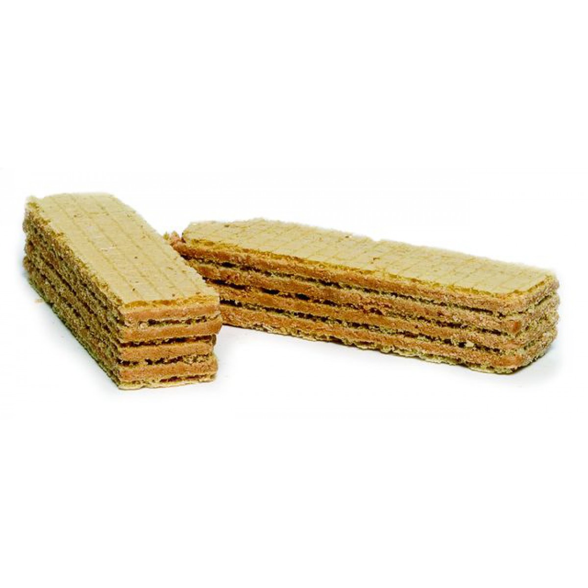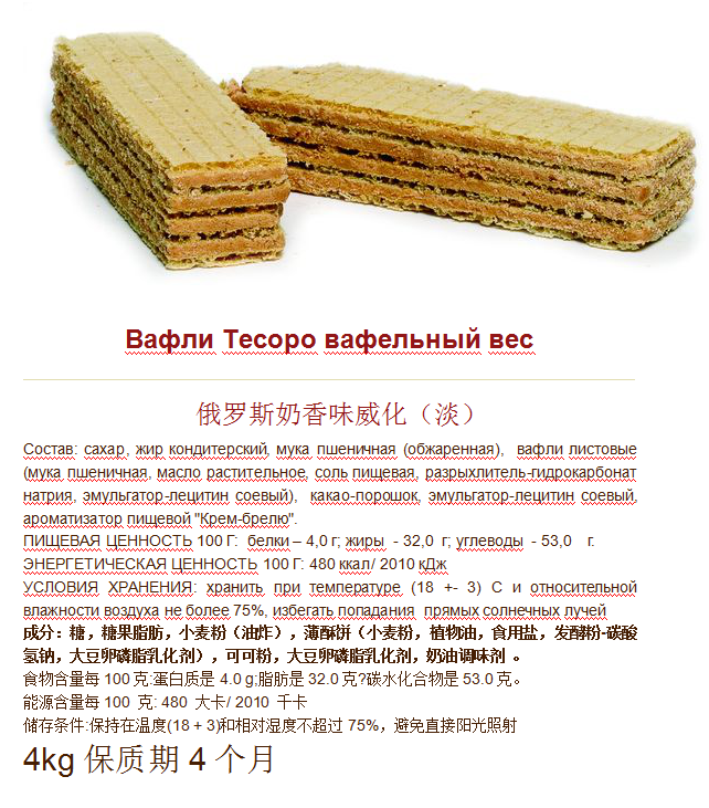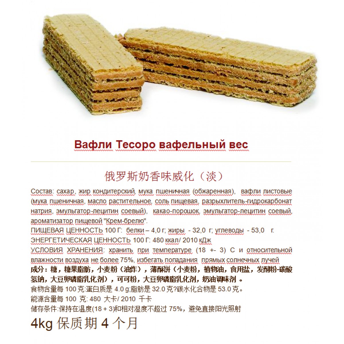 Состав: сахар, жир кондитерский, мука пшеничная (обжаренная), вафли листовые (мука пшеничная, масло растительное, соль пищевая, разрыхлитель-гидрокарбонат натрия, эмульгатор-лецитин соевый), какао-порошок, эмульгатор-лецитин соевый, ароматизатор пищевой "Крем-брелю".