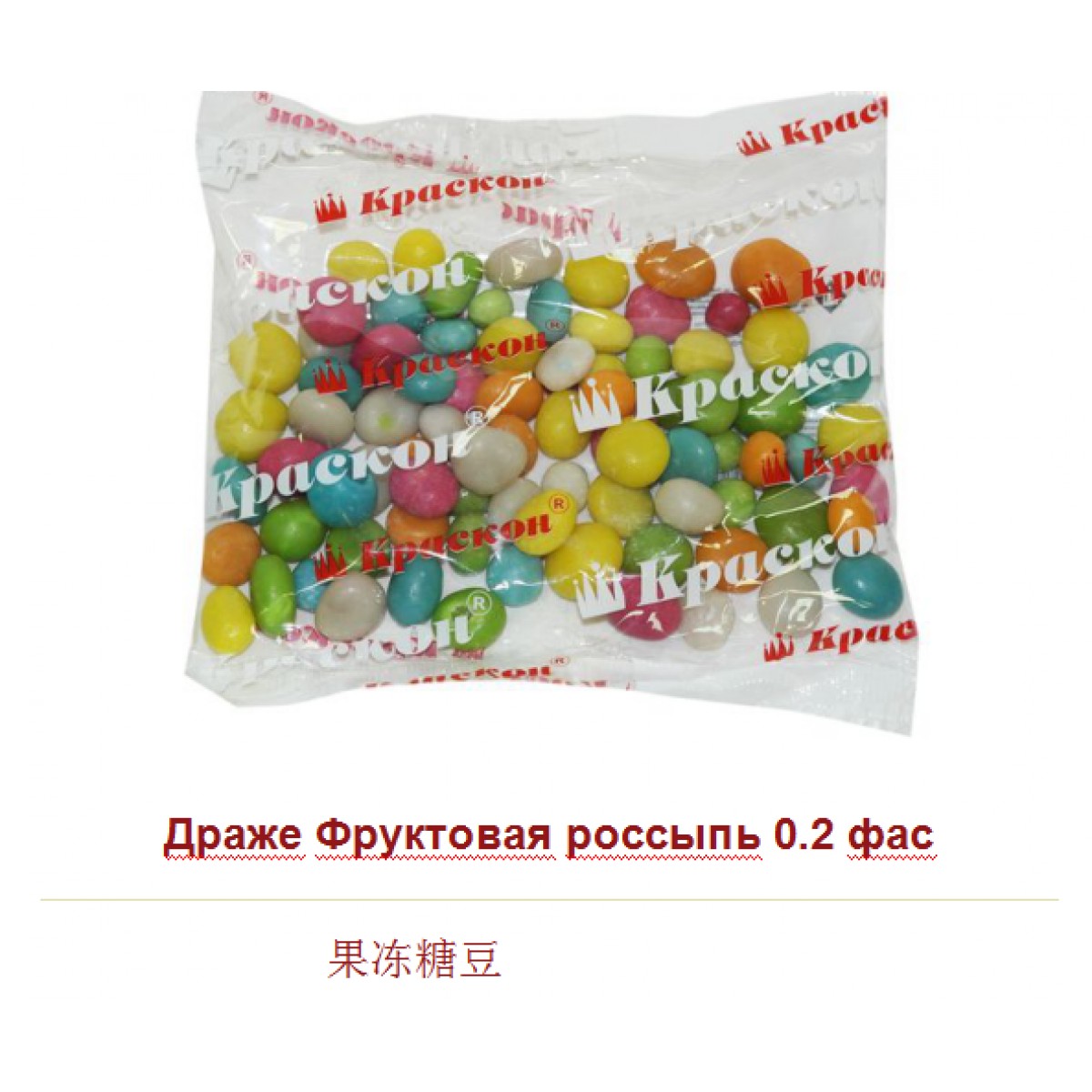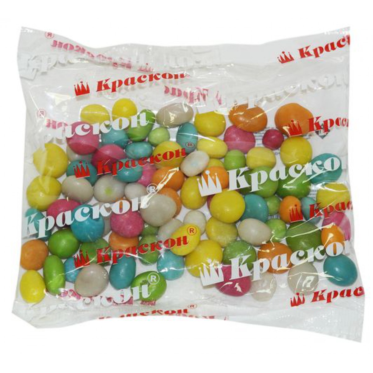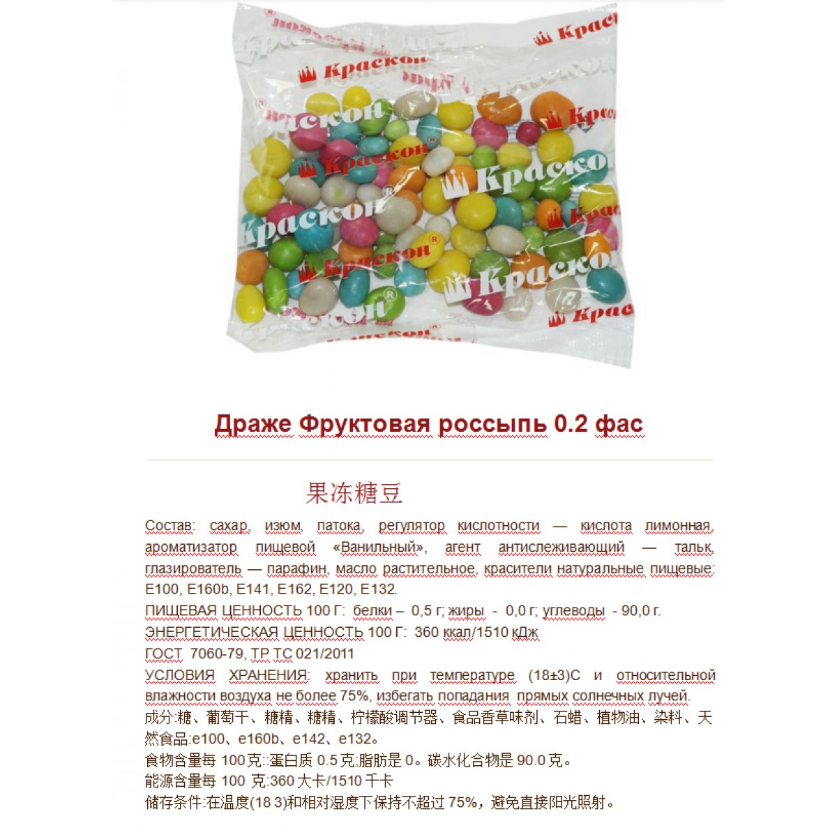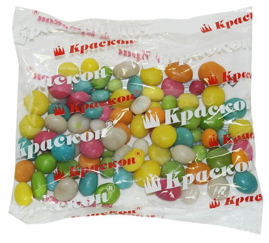 Состав: сахар, изюм, патока, регулятор кислотности — кислота лимонная, ароматизатор пищевой ?Ванильный?, агент антислеживающий — тальк, глазирователь — парафин, масло растительное, красители натуральные пищевые: Е100, Е160b, Е141, Е162, Е120, Е132.