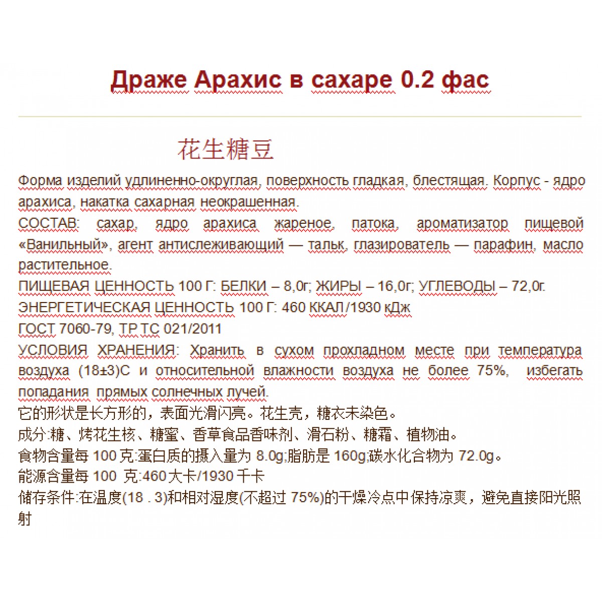 СОСТАВ: сахар, ядро арахиса жареное, патока, ароматизатор пищевой ?Ванильный?, агент антислеживающий — тальк, глазирователь — парафин, масло растительное.