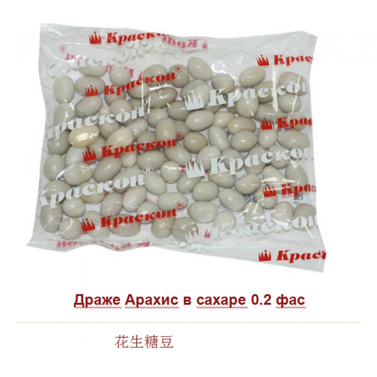 Форма изделий удлиненно-округлая, поверхность гладкая, блестящая. Корпус - ядро арахиса, накатка сахарная неокрашенная.