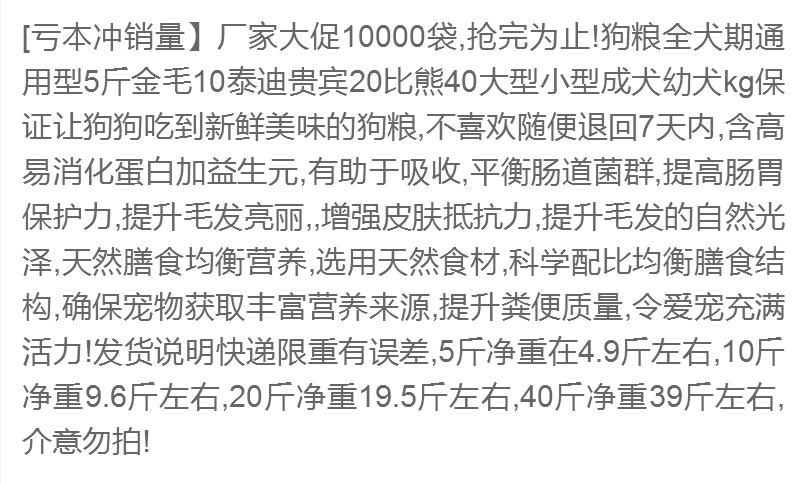 商品名稱:狗糧通用金毛泰迪貴賓比熊薩摩耶5斤10成犬幼犬小型犬40大型犬糧