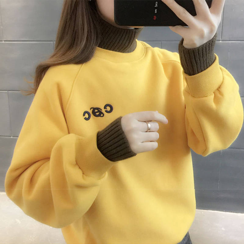 加絨衛(wèi)衣女2019秋冬新款半高領(lǐng)假兩件寬松韓版加厚時尚上衣外套潮
