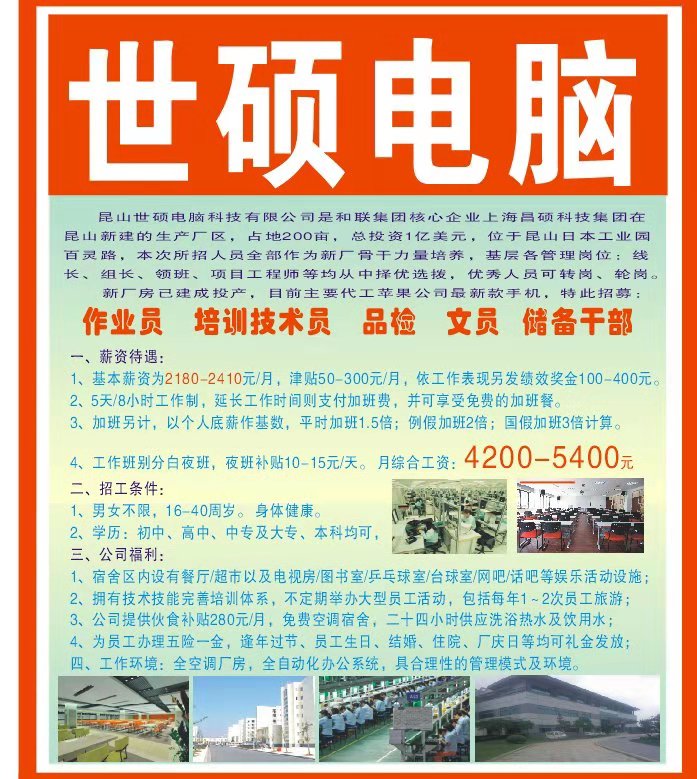 新廠房已建成投產,目前主要代工蘋果公司最新款手機。特此招募:昆山世碩電腦科技有限公司是和聯集團核心企業(yè)上海昌碩科技集團