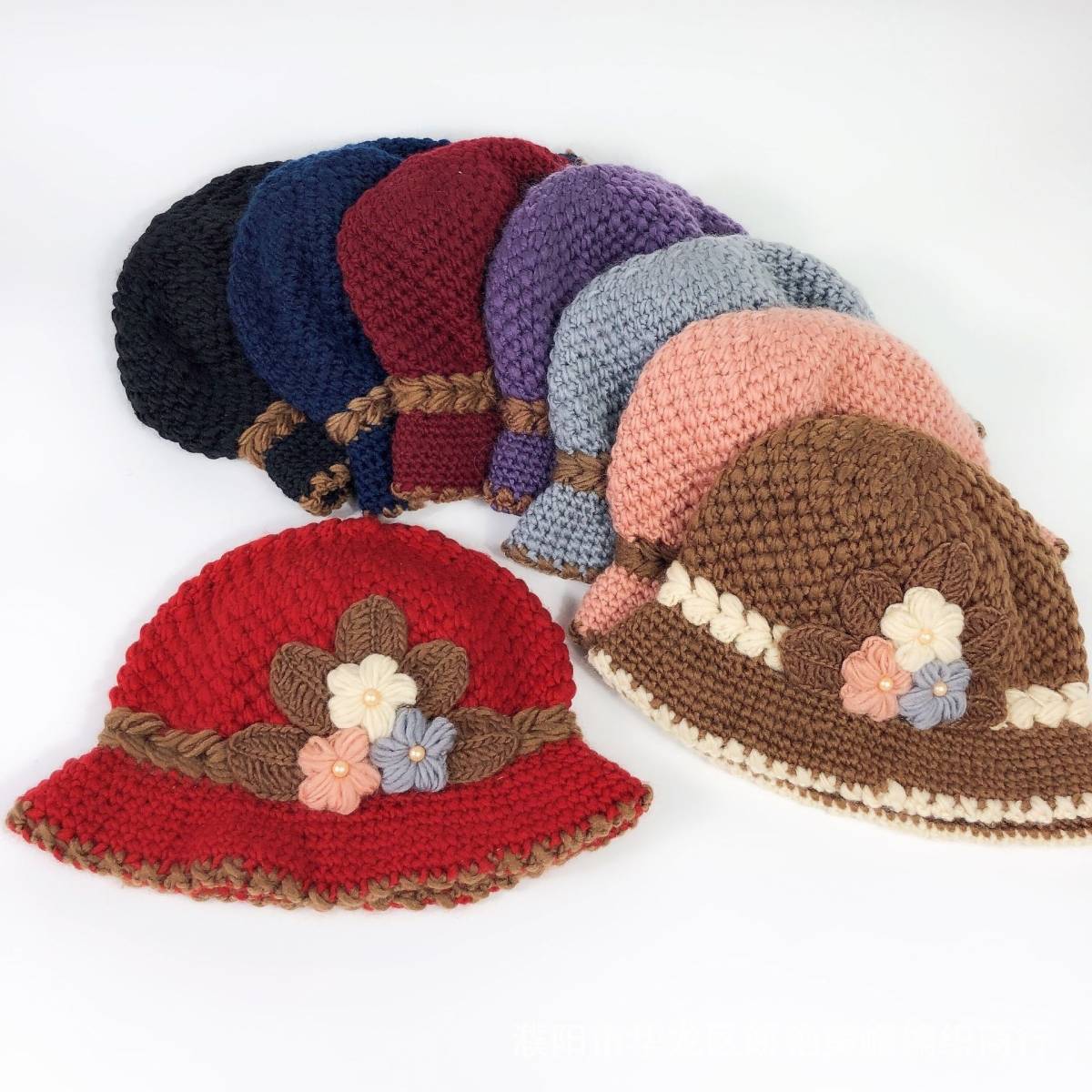 針織帽女士秋冬毛線帽經(jīng)典冬季女帽子花朵加絨漁夫帽盆帽媽媽冬帽