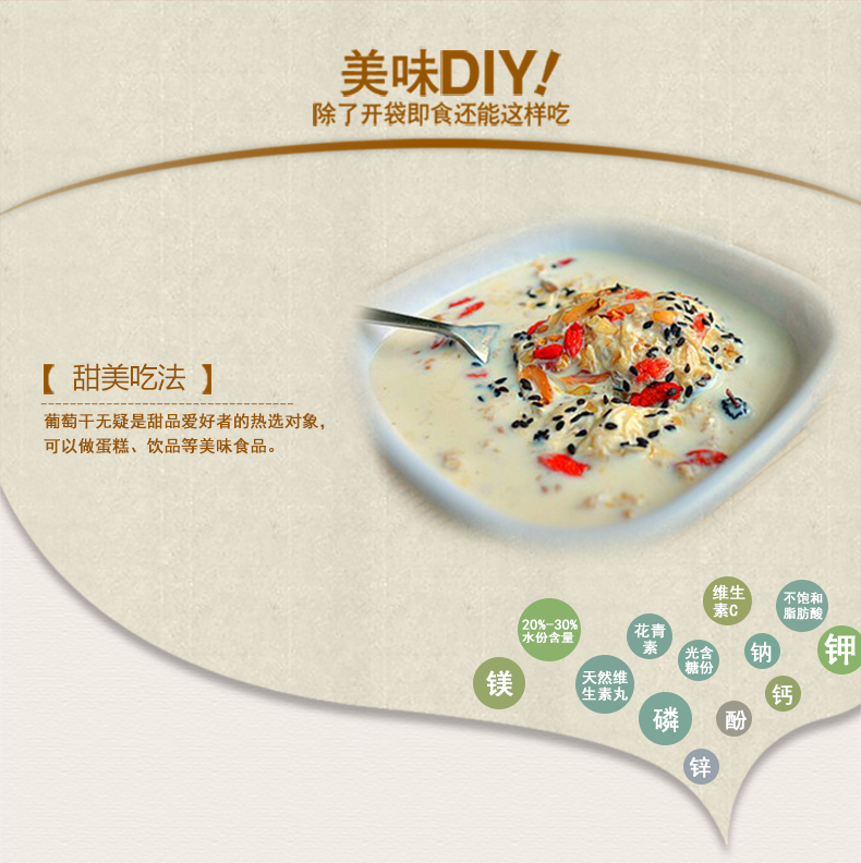 葡萄干 個(gè)頭大,肉多 營養(yǎng)價(jià)值含量很高 葡萄干含有的鐵和鈣含量十分多,葡萄干含有的鐵量比新鮮葡萄的15倍 有充分的鐵,鈣 防癌 改善手腳冰冷狀況