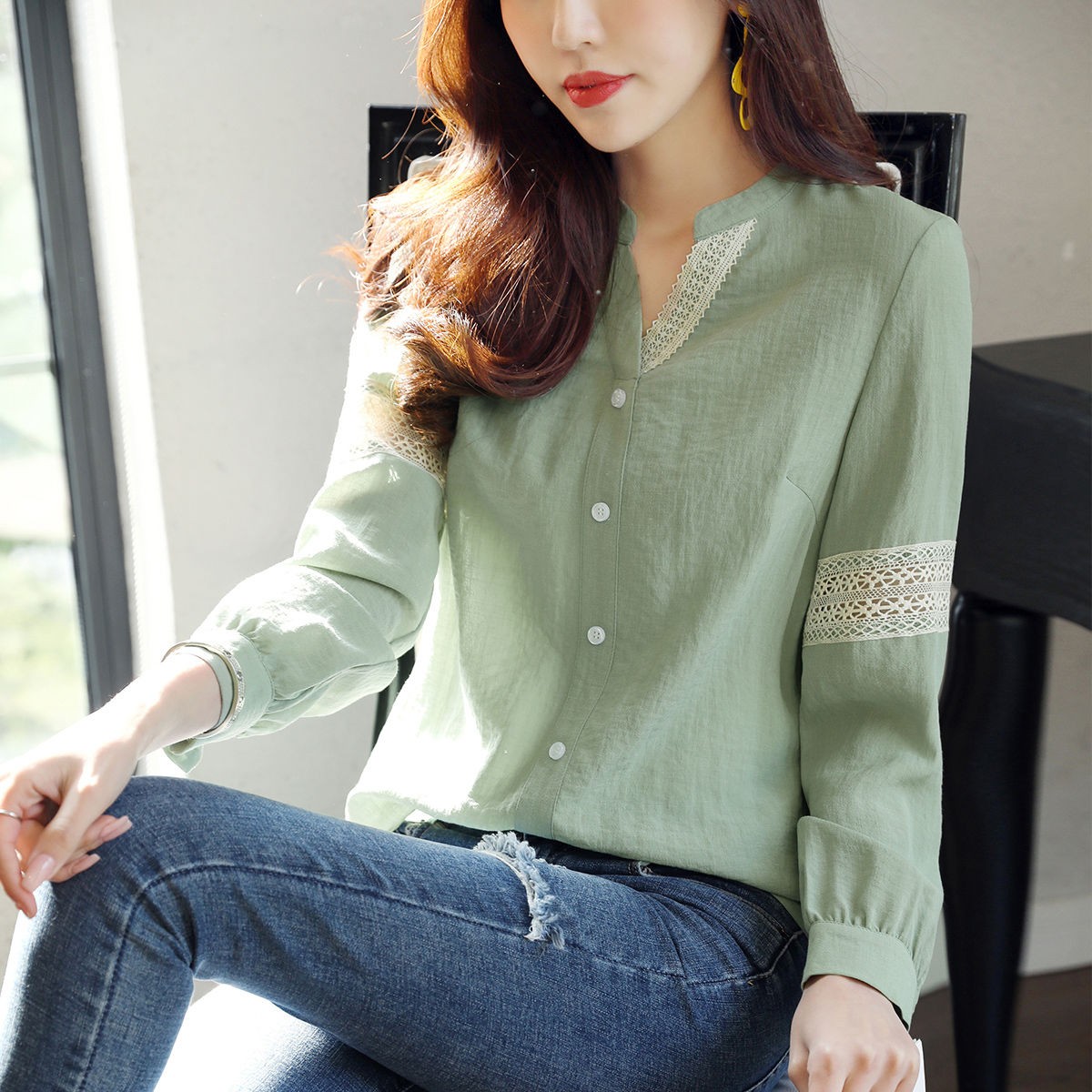 2020年春季新品女款韓版時(shí)尚百搭甜美拼接花邊V領(lǐng)襯衫