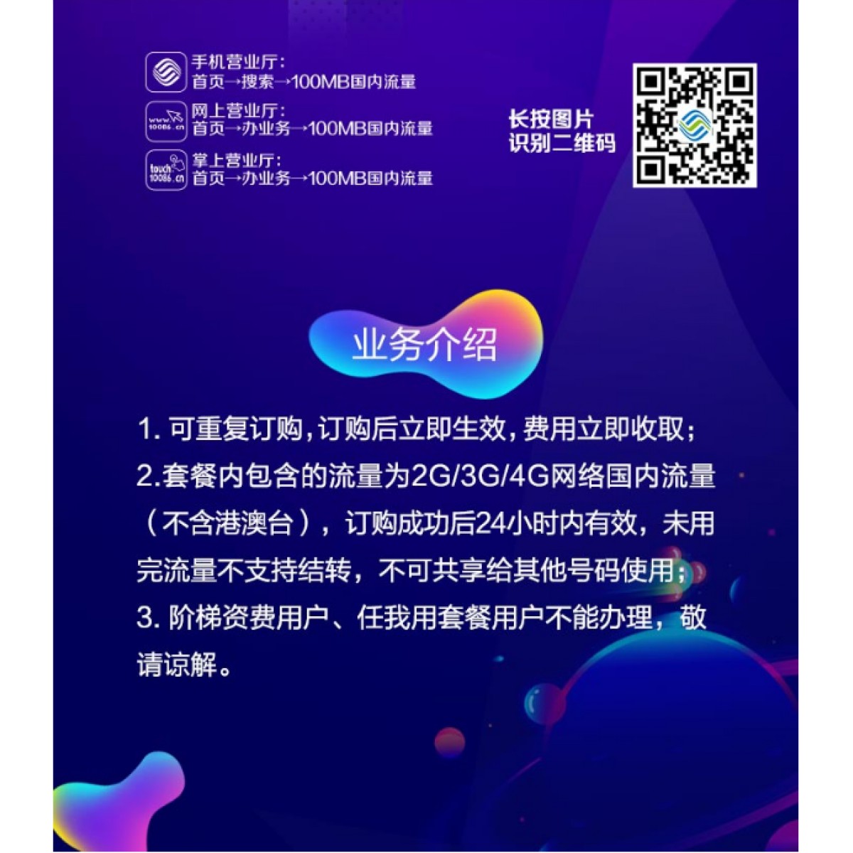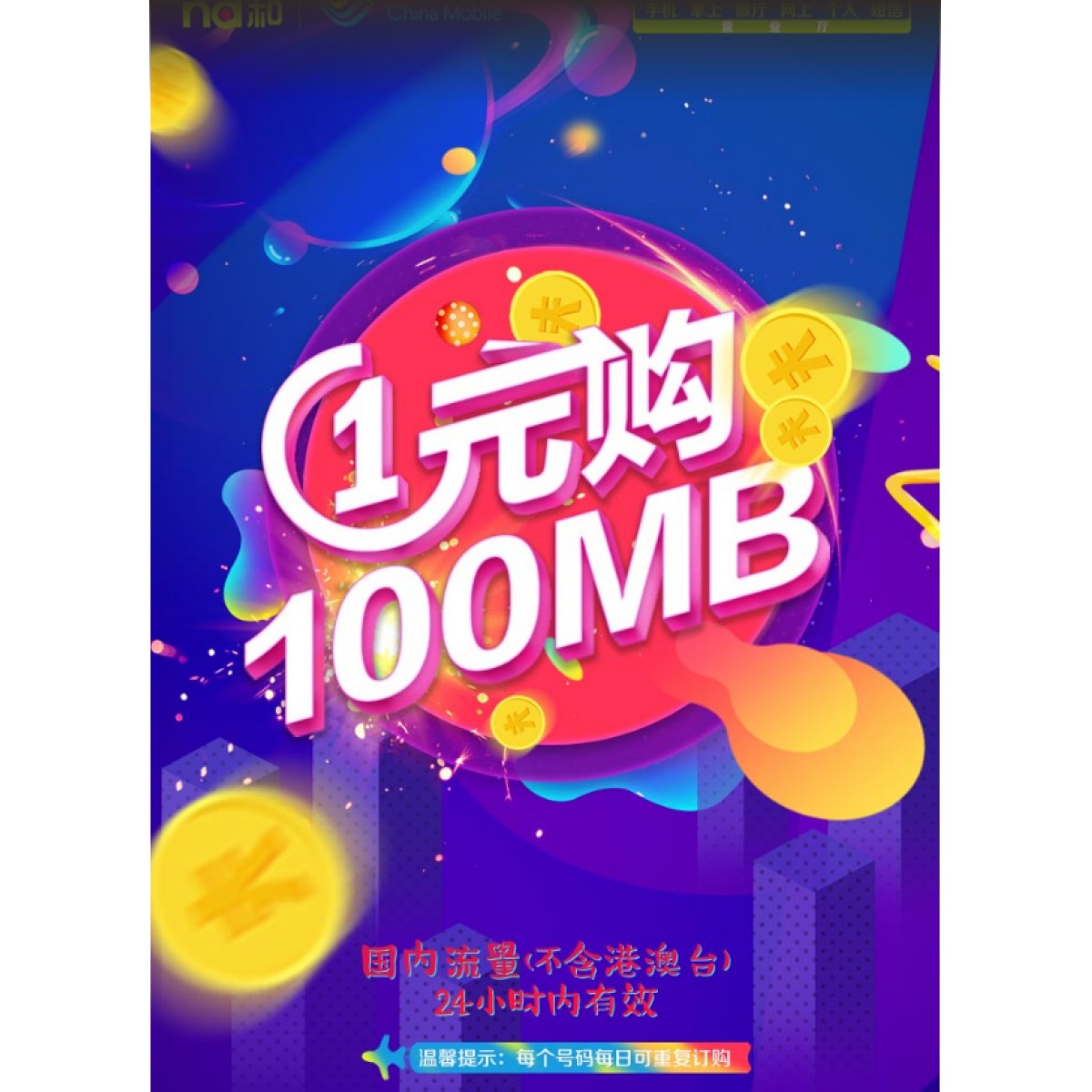 1元包含100MB流量,流量為2G/3G/4G網(wǎng)絡(luò)國內(nèi)流量(不含港澳臺)日包,訂購成功后24小時內(nèi)有效。