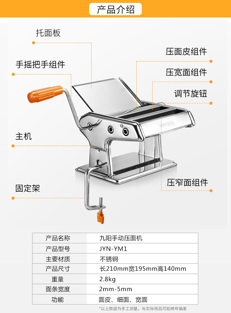 商品名稱:九陽面條機(jī)多功能壓面機(jī)家用小型手動(dòng)不銹鋼和面搟面餛飩餃皮子機(jī)