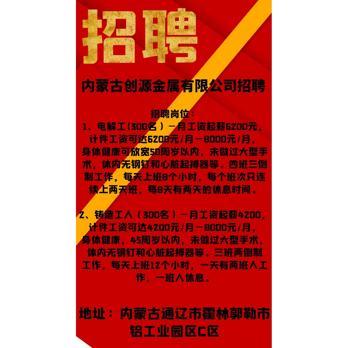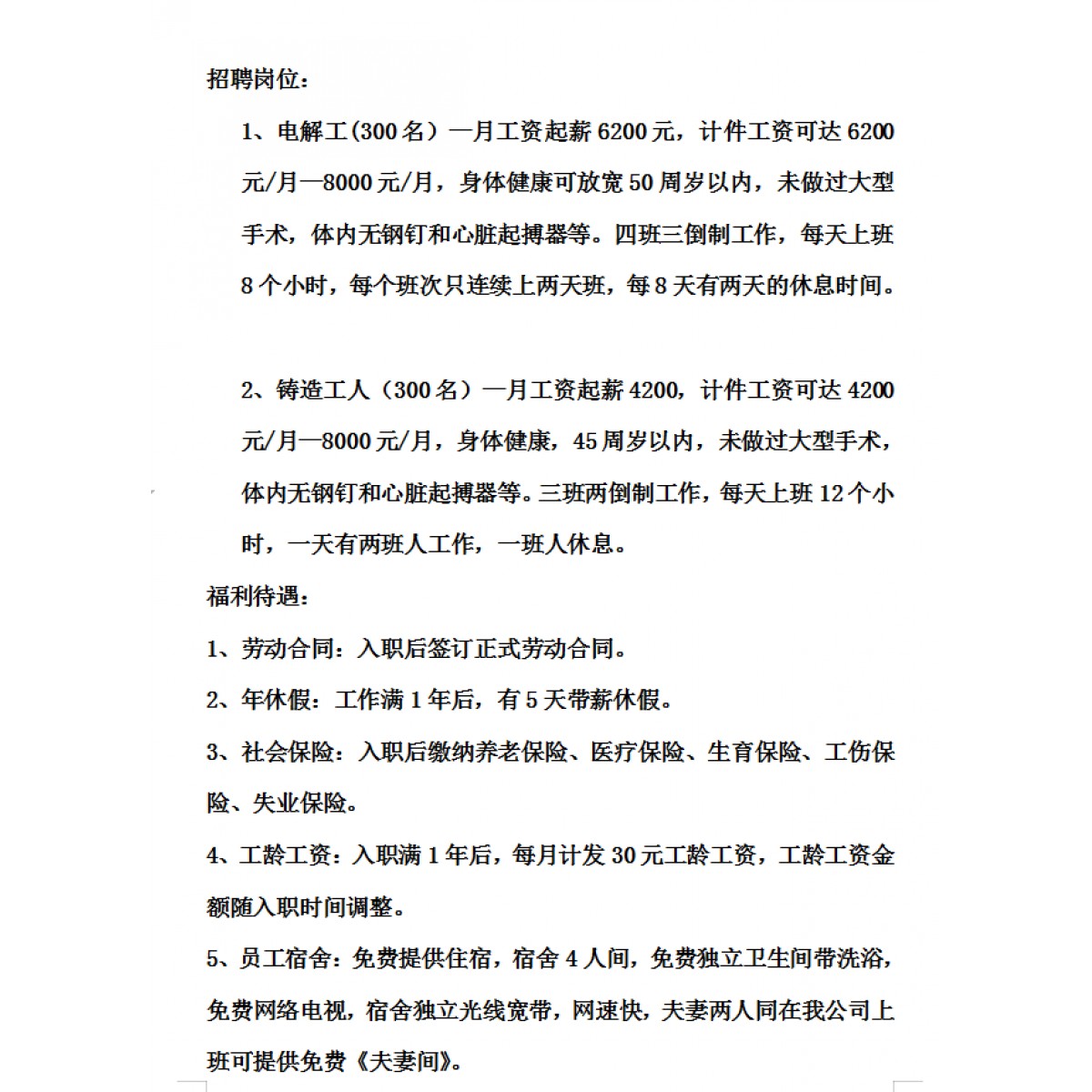 1、電解工(30-50名)—月工資起薪6600元,計件工資可達6600元/月—8500元/月,身體健康可放寬50周歲以內,未做過大型手術,體內無鋼釘和心臟起搏器等。四班三倒制工作,每天上班8個小時,每個班次只連續(xù)上兩天班,每8天有兩天的休息時間。