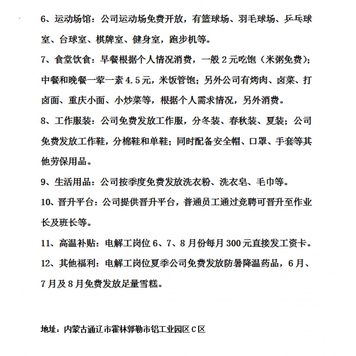 12、其他福利:電解工崗位夏季公司免費發(fā)放防暑降溫藥品,6月、7月及8月免費發(fā)放足量雪糕。
