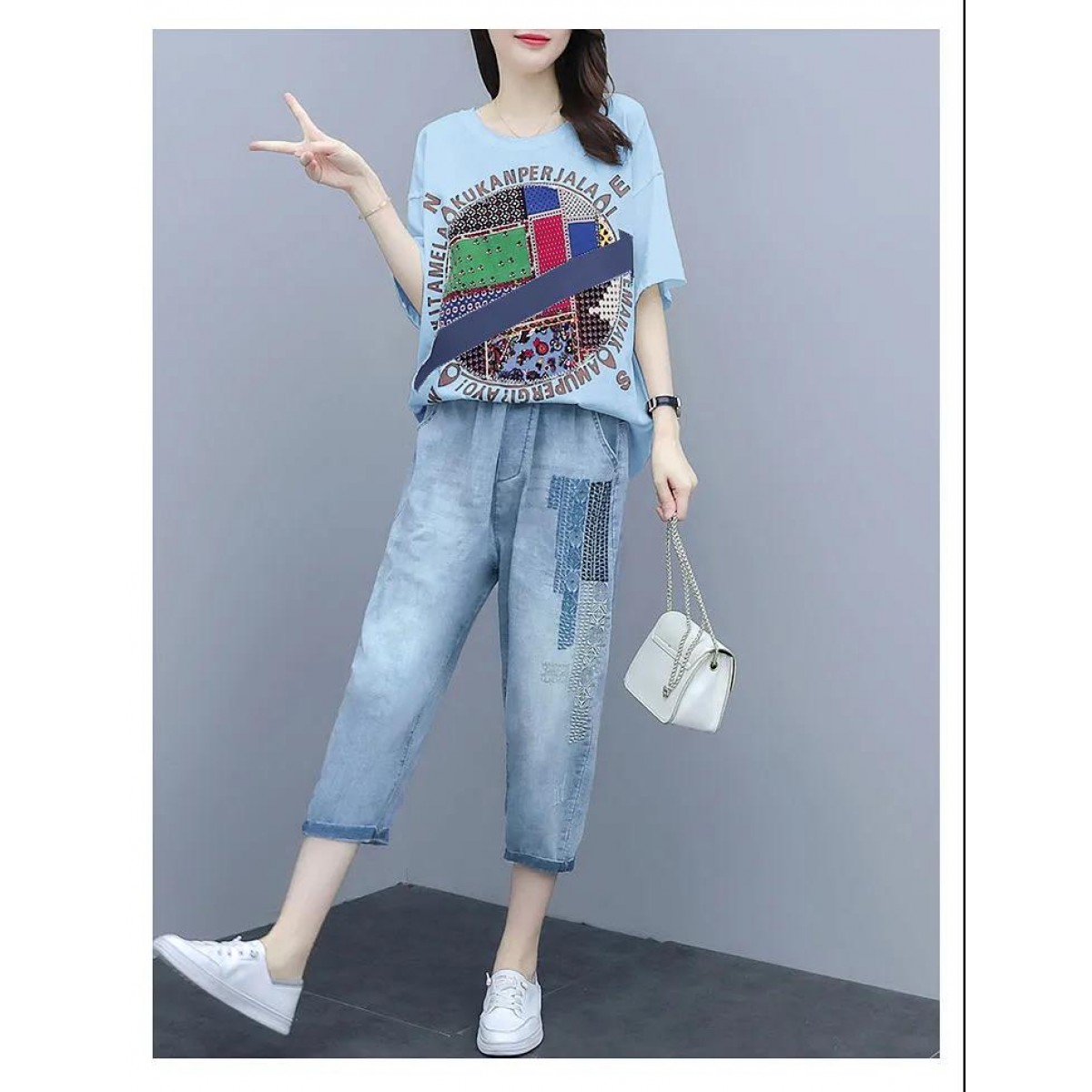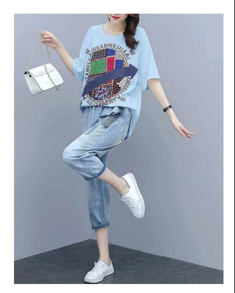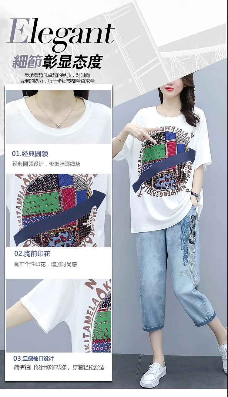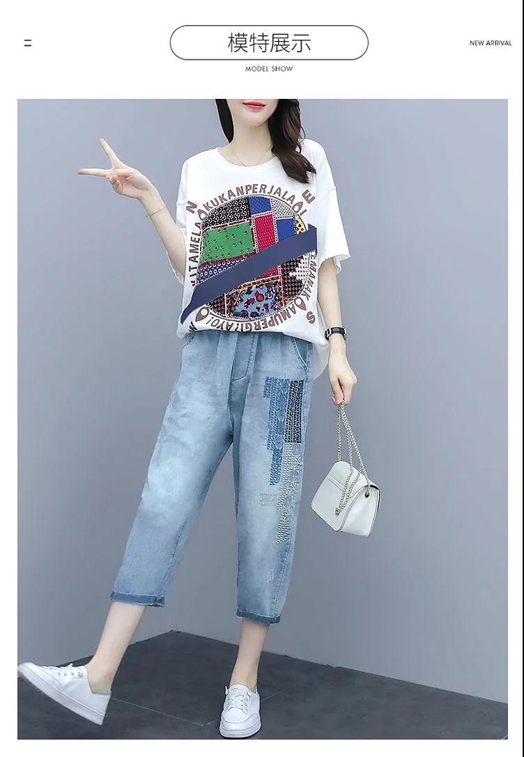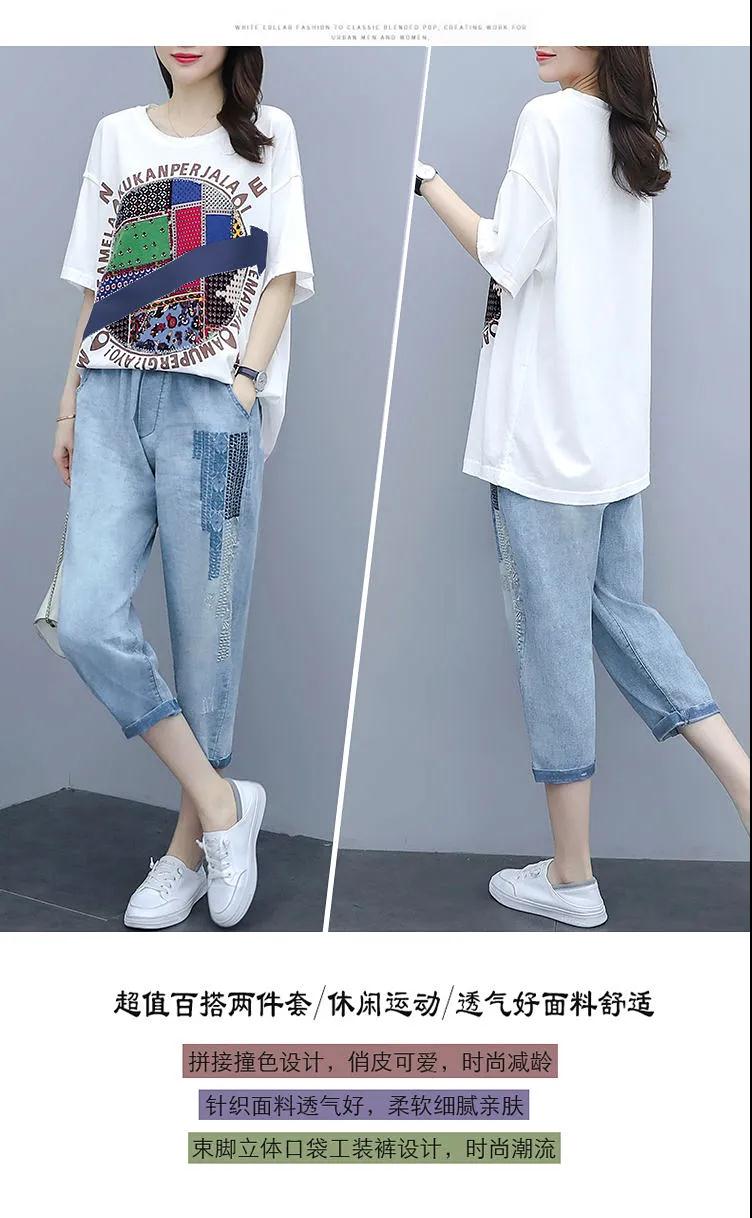 2020年夏季單/套裝新款韓版寬松大碼拼貼刺繡休閑時尚套裝女夏裝