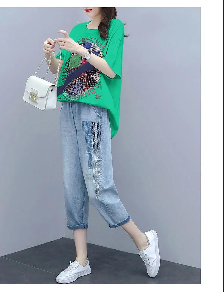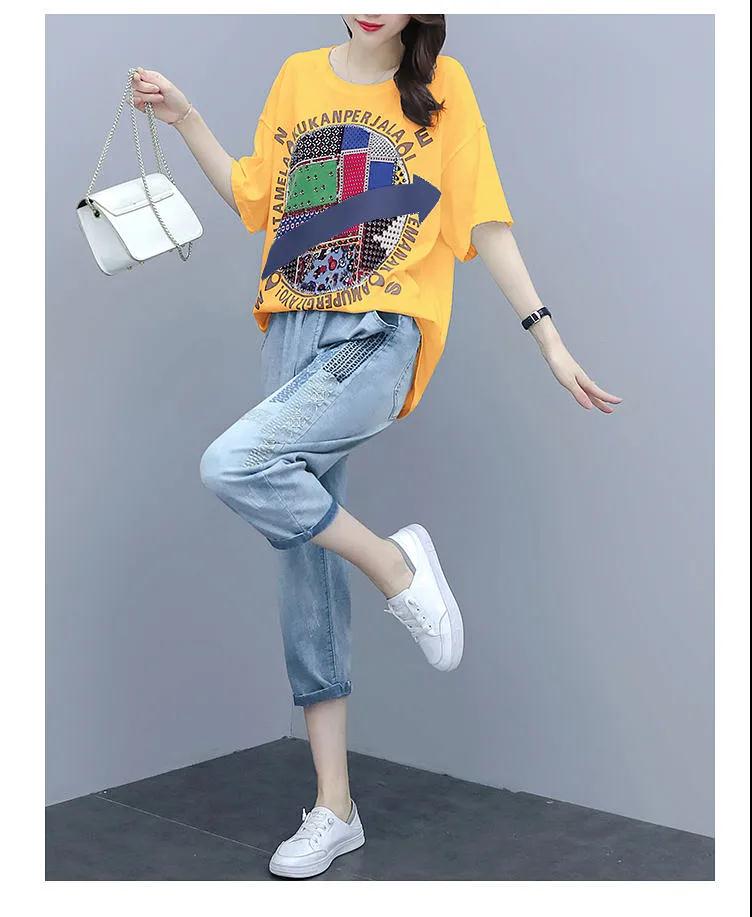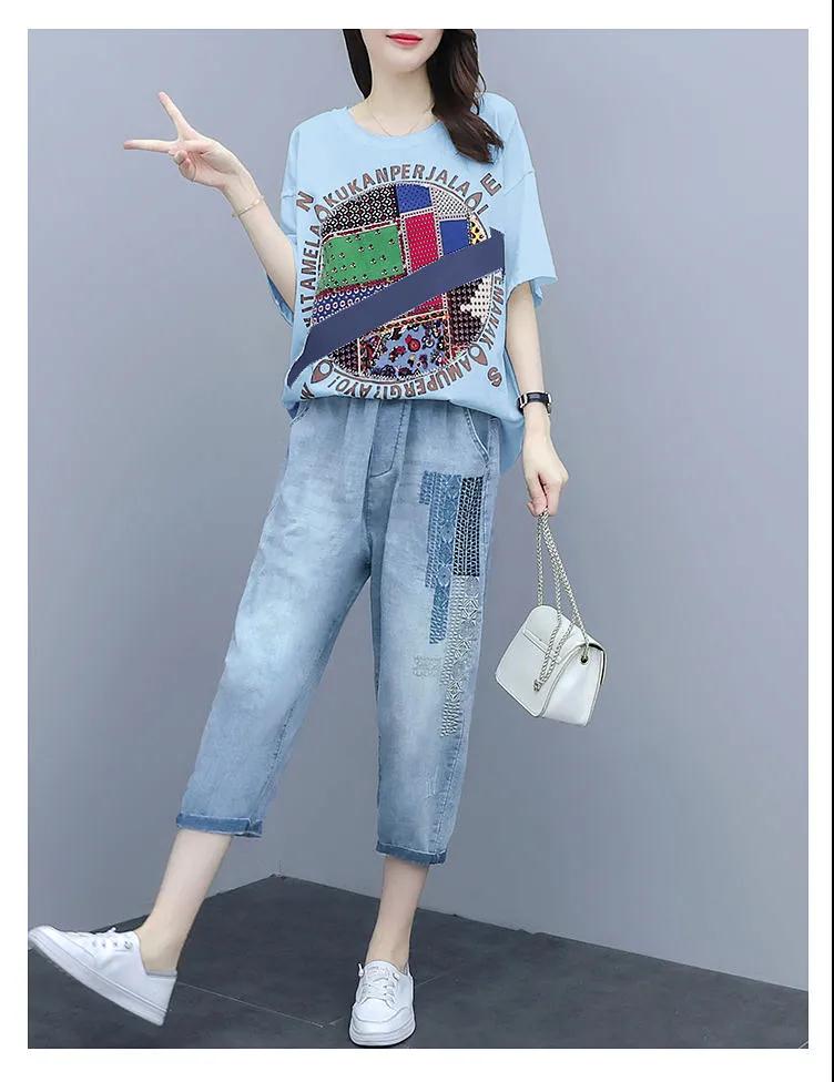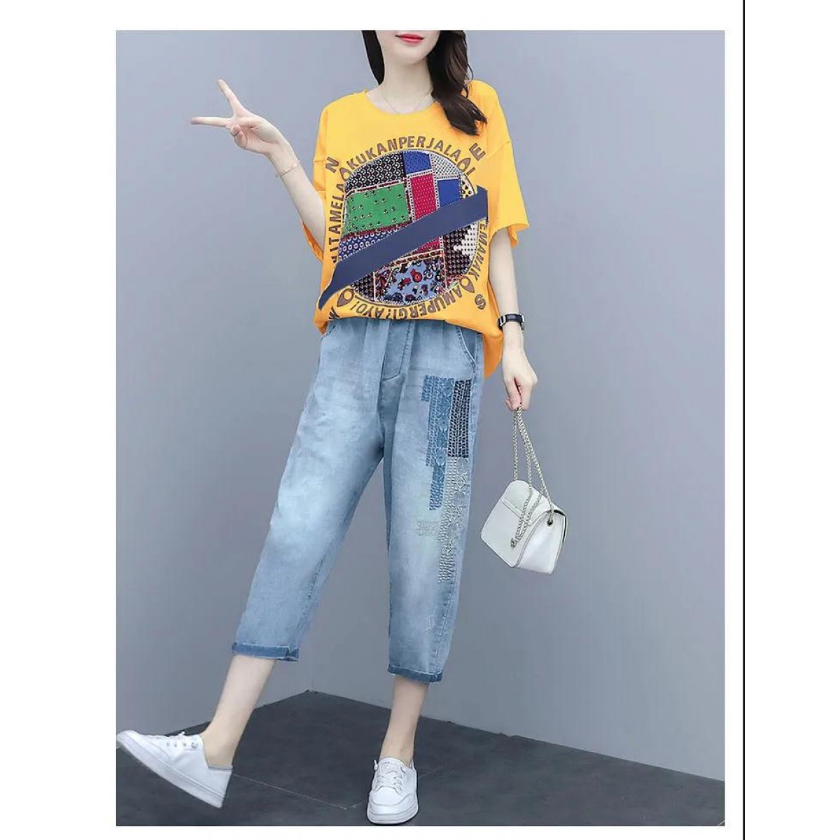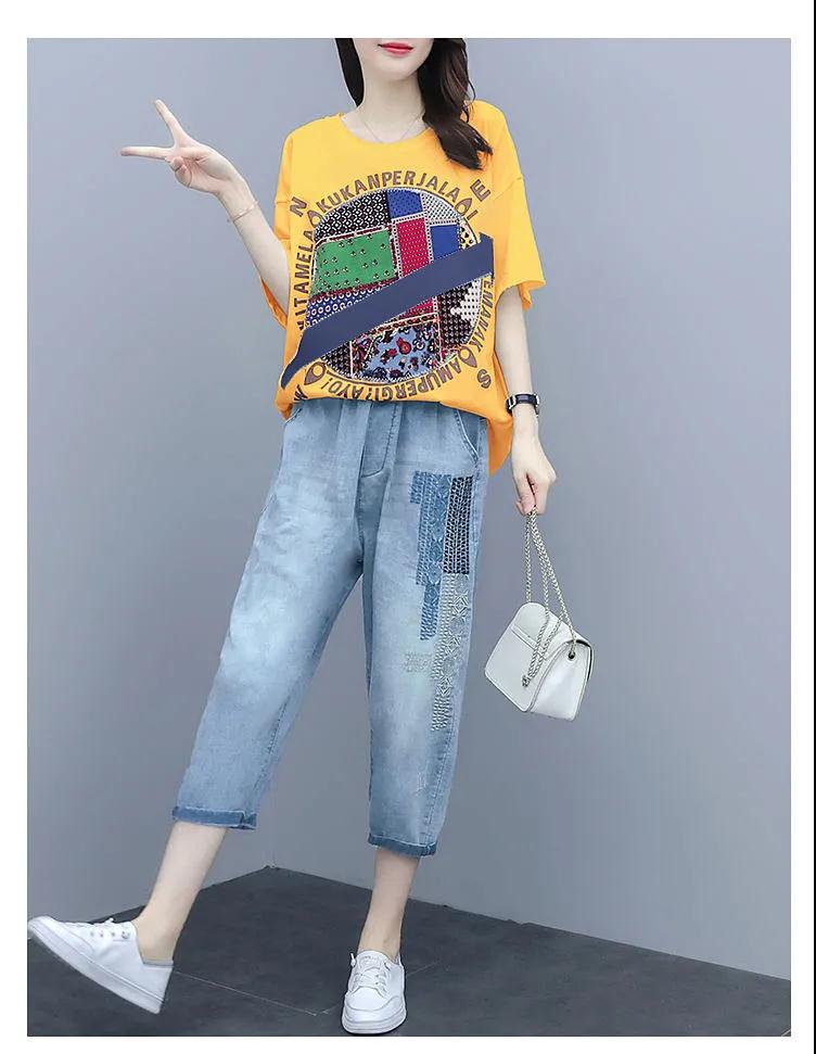 2020年夏季單/套裝新款韓版寬松大碼拼貼刺繡休閑時尚套裝女夏裝