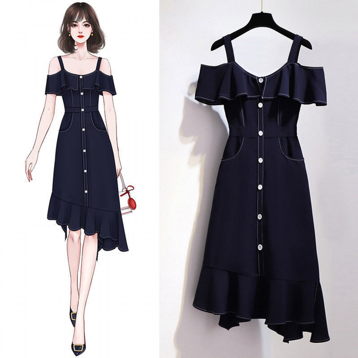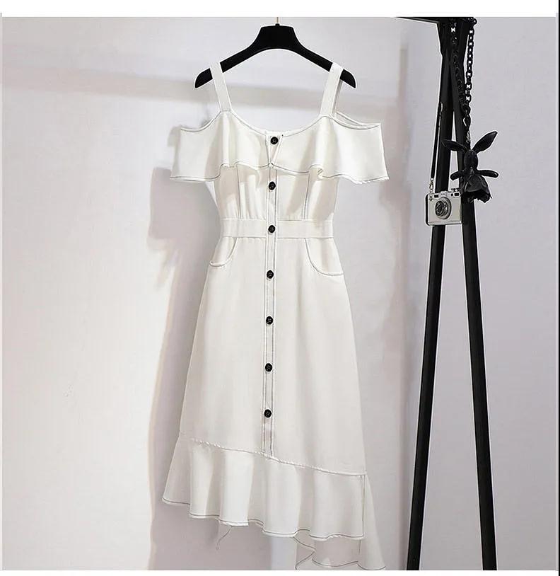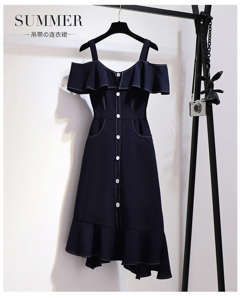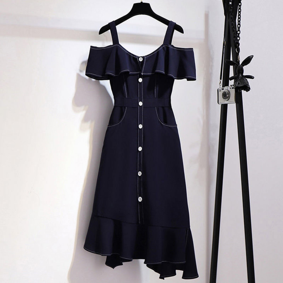 商品名稱:大碼女裝2020新款夏季一字肩氣質(zhì)收腰顯瘦胖妹妹不規(guī)則背帶連衣裙
