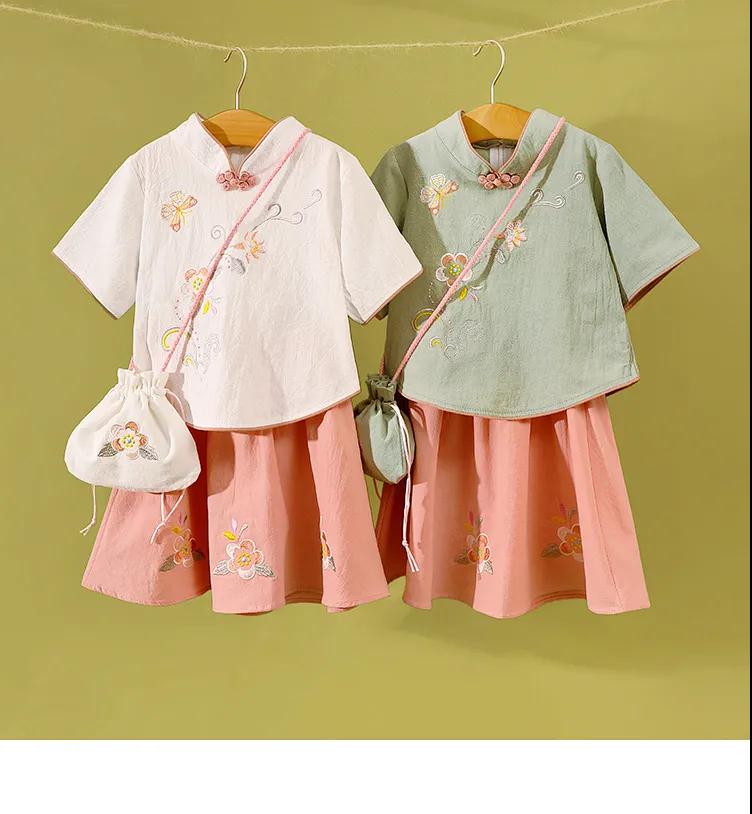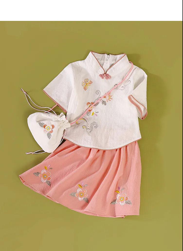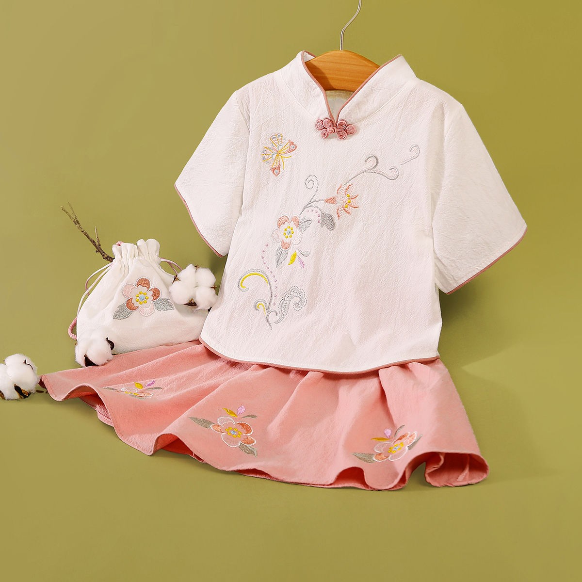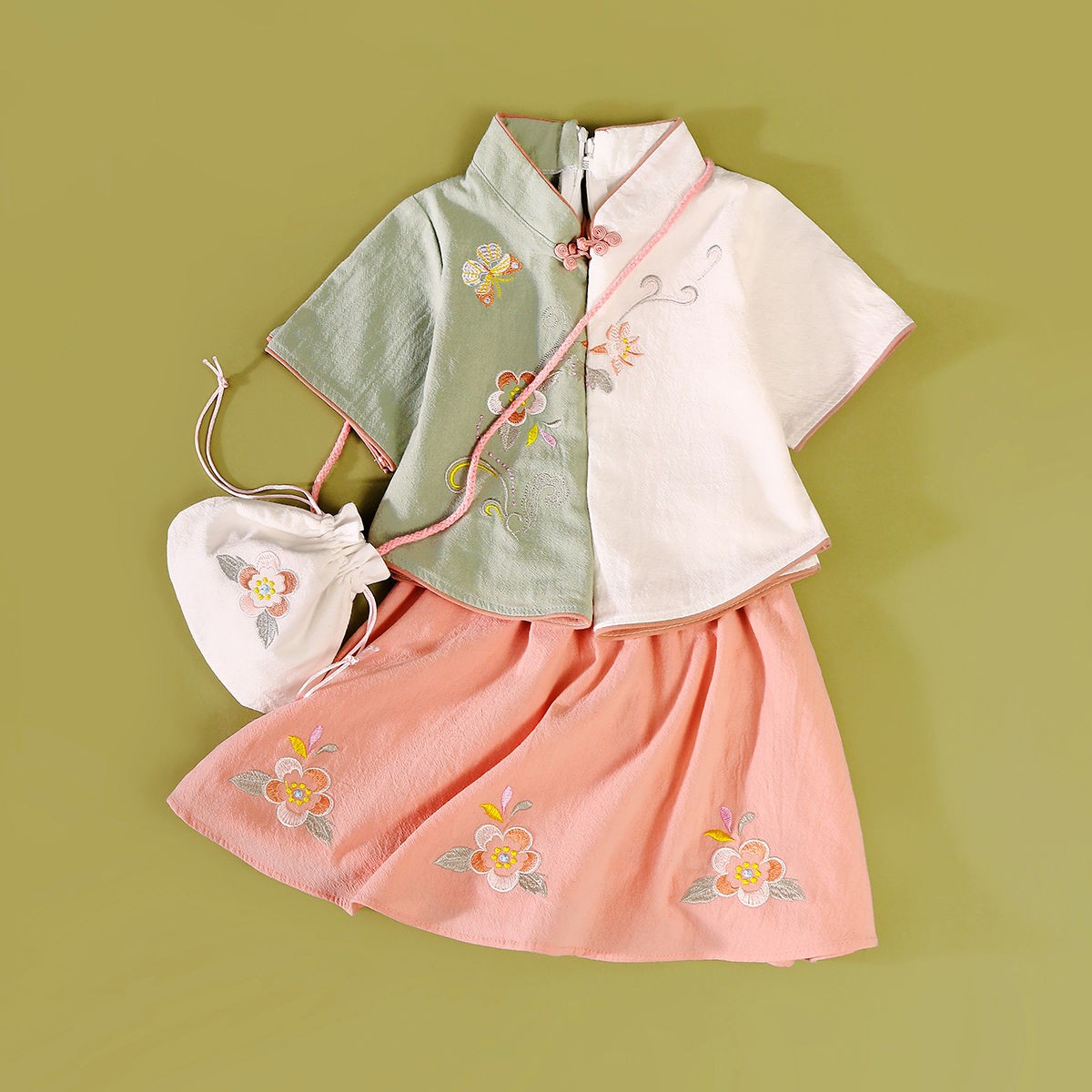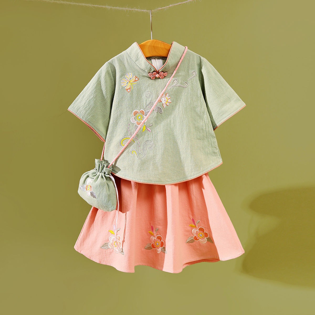 童裝女童中國風(fēng)春夏新款中童中式復(fù)古旗袍刺繡兒童漢服套裝