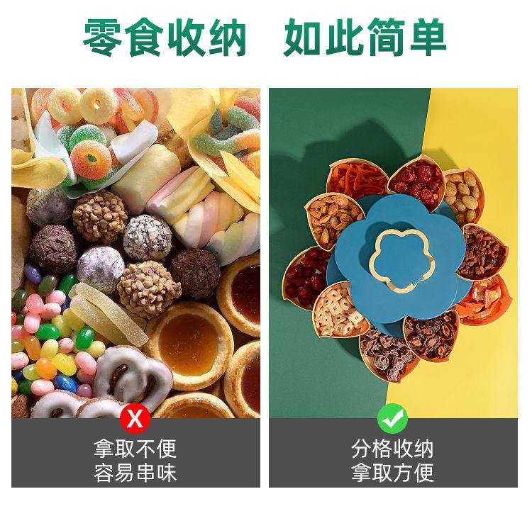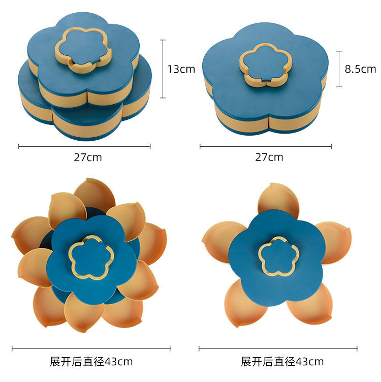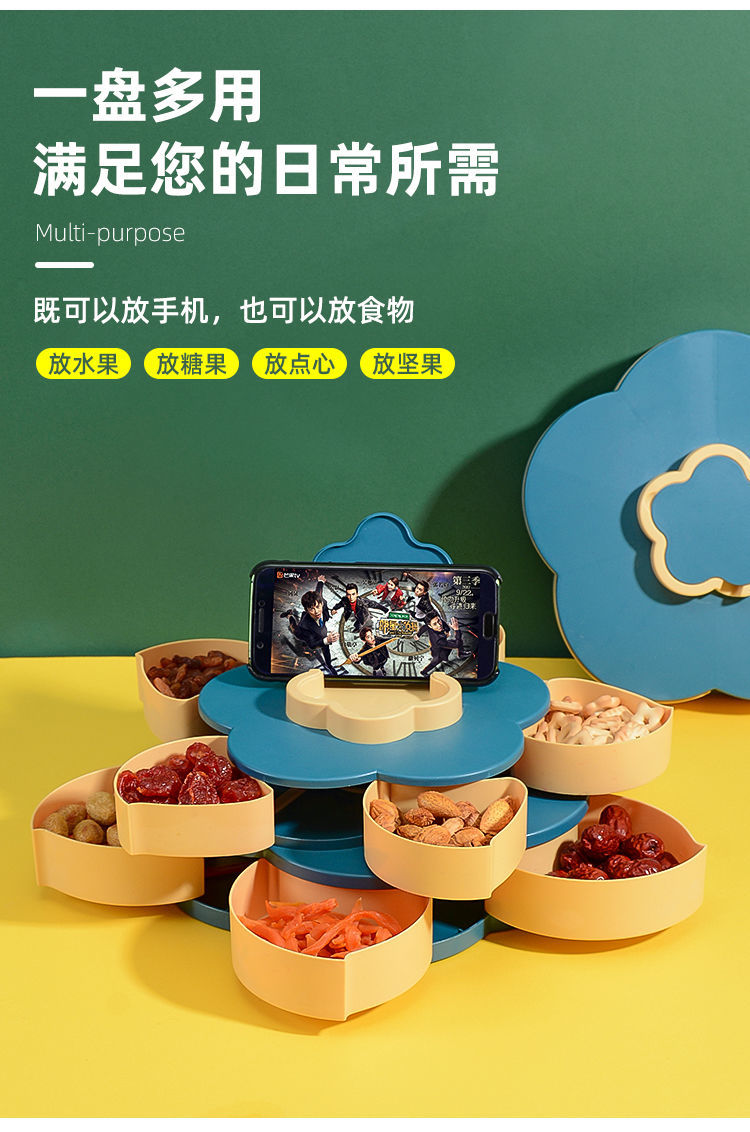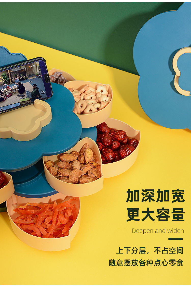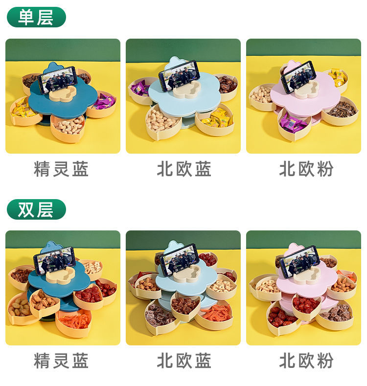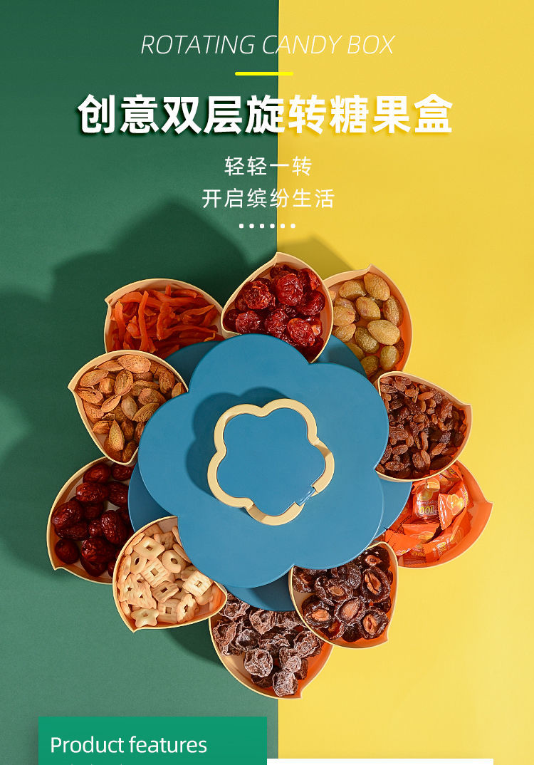 商品名稱:糖果盒旋轉(zhuǎn)花朵客廳家用干果堅果零食盒帶蓋分格茶幾果盤多格果盒
