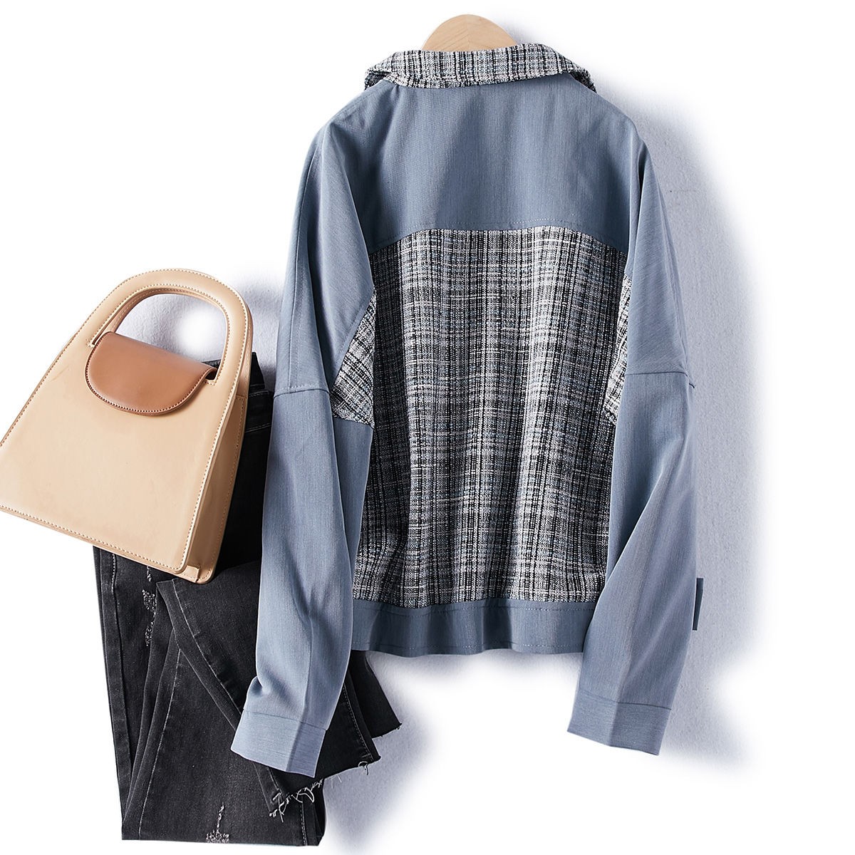 2021年春季新款女款時尚簡約百搭顯瘦純色拼接格紋小香風(fēng)外套