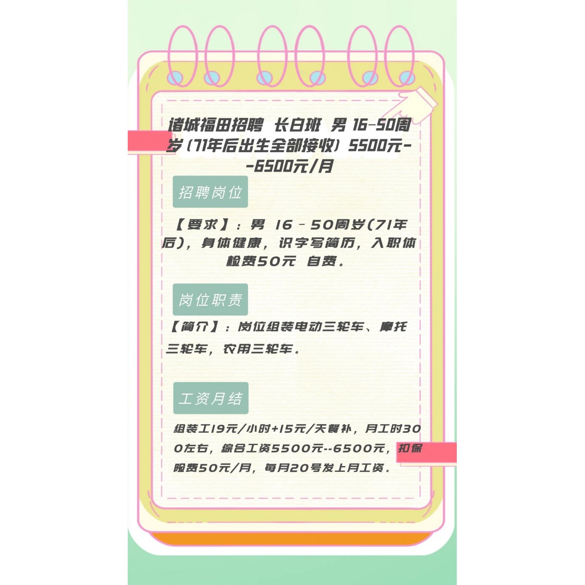 諸城福田招聘 長(zhǎng)白班 男 16–50周歲(71年后出生全部接收) 5500元--6500元/月